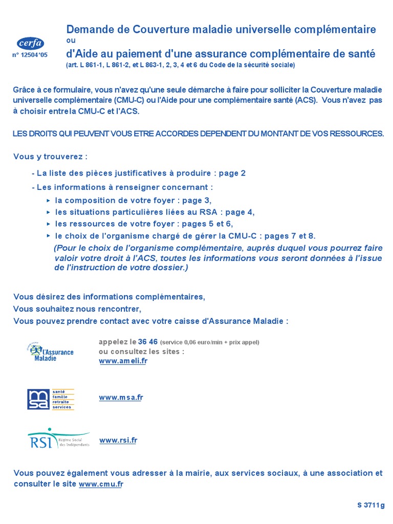Le formulaire de demande de CMU complmentaire n est plus le formulaire S37mais le cerfa 1250 qui est en tlchargement libre ci-dessus. Lorsque votre demande sera accepte, ce formulaire. Avant d envoyer votre formulaire l assurance maladie, vous deviez vous assurer de respecter les plafonds de ressources CMU pour 2015). Cerfa n S3711h - Demande couverture maladie universelle complmentaire (CMUC ) ou d Aide au paiement d une assurance complmentaire sant (ACS) Lire. Formulaire : Cerfa n S3711h - Demande couverture.