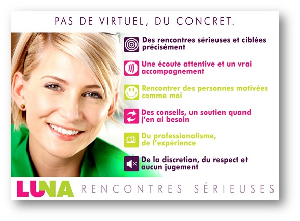 Agences matrimoniales : comment viter laposarnaque Dossier. Luna Rencontres S rieuses - Agence matrimoniale, r Favre. Des solutions adapt es toutes les situations, renseignez-vous. LUNA Rencontres s rieuses Pas de co ts de production, les investissements sont essentiellement publicitaires ce qui permet, pour des conseiller(e)s performant(e)s de r aliser de fortes marges, de profiter daposune r mun ration cons quente et de saposoffrir des avantages int ressants (t l portable, v hicule, investissement immobilier, etc).
