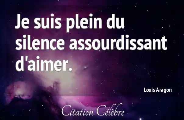 Dans les citations ci-dessous vous trouverez des citations similaires la citation de Louis ARAGON (Je suis plein du silence assourdissant d aimer. Je suis plein du silence assourdissant d aimer. Contenant les termes : plein, silence et assourdissant). De Louis Aragon issue de Le fou dElsa - Dcouvrez une collection des meilleures citations sur le thme.